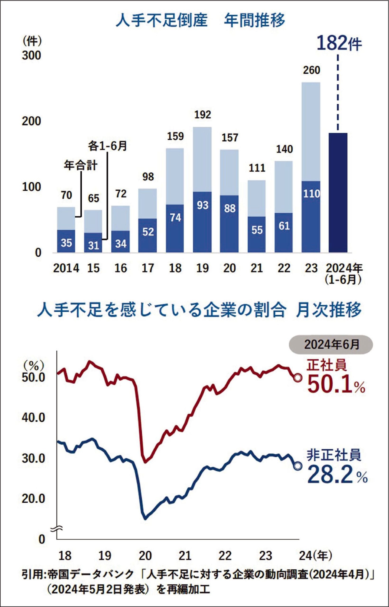 帝国データバンクがまとめた2024年上半期(1月~6月)の人手不足倒産の動向調査によると、人手不足倒産件数は182件で、前年同期に比べ1.65倍に増えた。13年以降の最多件数を2期連続で更新した。特に4月から時間外労働の上限規制が適用され...