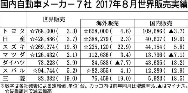 乗用車メーカー7社(ホンダを除く)が28日に発表した2017年8月の世界販売実績は、7社すべてが4カ月連続で前年同月実績を上回った。トヨタ自動車、日産自動車、スズキとマツダとスバルは8月として過去最高だった。トヨタは世界販売と海外販売で、...