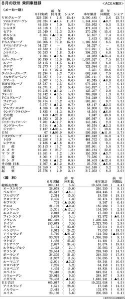 2017年8月のメーカー別欧州乗用車登録は、PSAグループが、オペル/ボグゾールをグループに加えたことから8割近い伸び。シェアも前月の9・9%に対し15・2%までアップした。VWグループ、BMWグループは微増。ルノーグループは2桁増で、ボ...