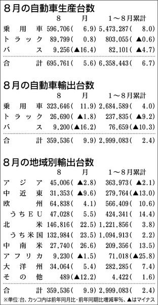 日本自動車工業会(自工会、西川廣人会長)が29日にまとめた8月の生産・輸出実績は、四輪車の国内生産台数が前年同月比5・6%増の69万5761台だった。10カ月連続で増加した。メーカー各社が投入した新型車の販売が好調なことに加えて、欧米を中...