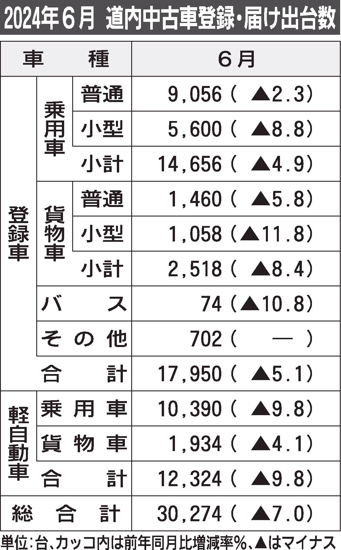 北海道内の2024年6月中古車登録・届け出台数は、前年同月比7.0%減の3万274台だった。登録車と軽自動車ともに前年同月の台数より減少した。 日本自動車販売協会連合会の中古車登録台数と全国軽自動車協会連合会の軽自動車中古車販売台数をまと...