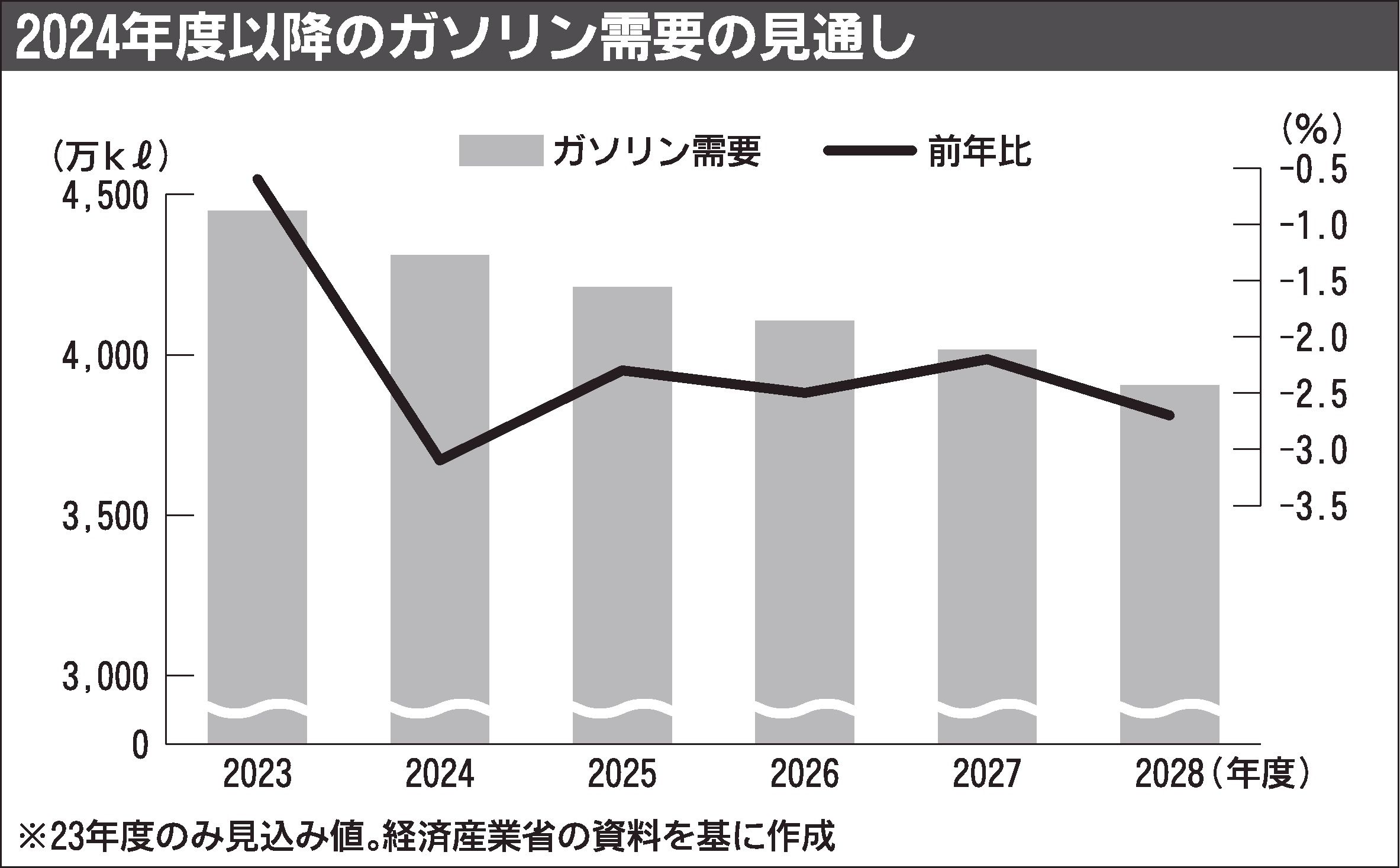 経済産業省の試算によると、2028年度のガソリン需要は23年度の4449万㌔㍑(実績見込み)に比べて12.2%減の3906万㌔㍑となる見通しだ。24年度以降、年平均2.6%ずつ減ると想定したもので、23年度の前年比0.6%減に比べると落ち...