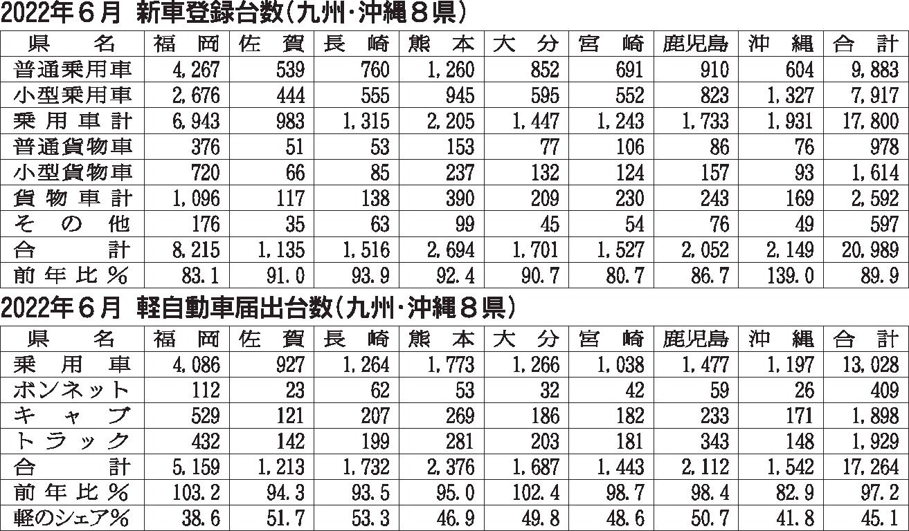 九州・沖縄地区の2022年上期(1~6月)の新車販売台数(登録車と軽自動車合計)は、前年同期比15・7%減の24万2121台となり、2年ぶりにマイナスに転じた。コロナ禍からの反転攻勢が期待されたが、半導体をはじめ部品不足の影響などを受けて...