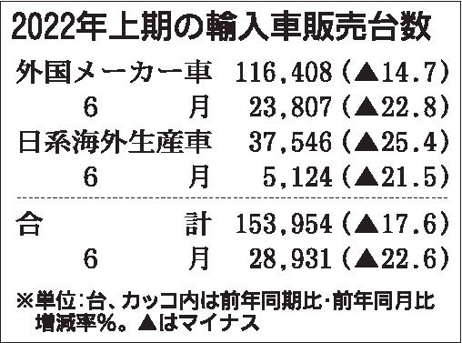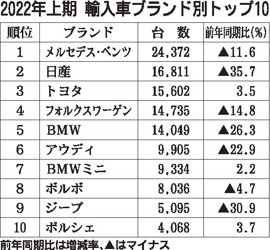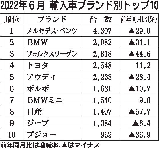 2022年1~6月の外国メーカー車新車販売、14%減 登録車シェア過去最高 ブランド別はメルセデス・ベンツが8年連続首位