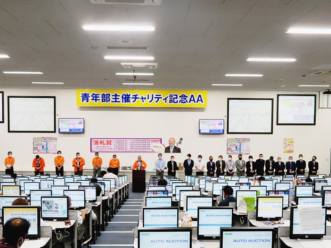 JU東京(萩田典雄理事長)は4日、「青年部主催チャリティ記念AA」を開催した=写真。全体の出品台数は1881台と目標の2千台を下回ったが、青年部は618台と目標の600台を上回り、成約率は73・7%だった。競り開始前のあいさつで東山喜明青...