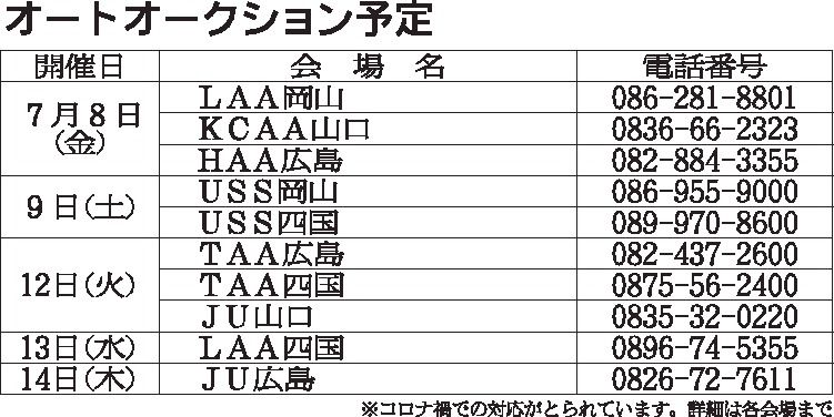 〈オートオークション予定〉中四国地区 2022/7/8~14