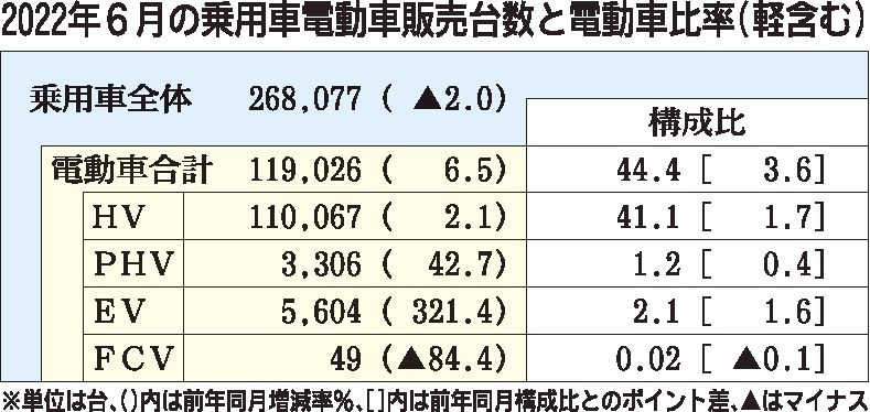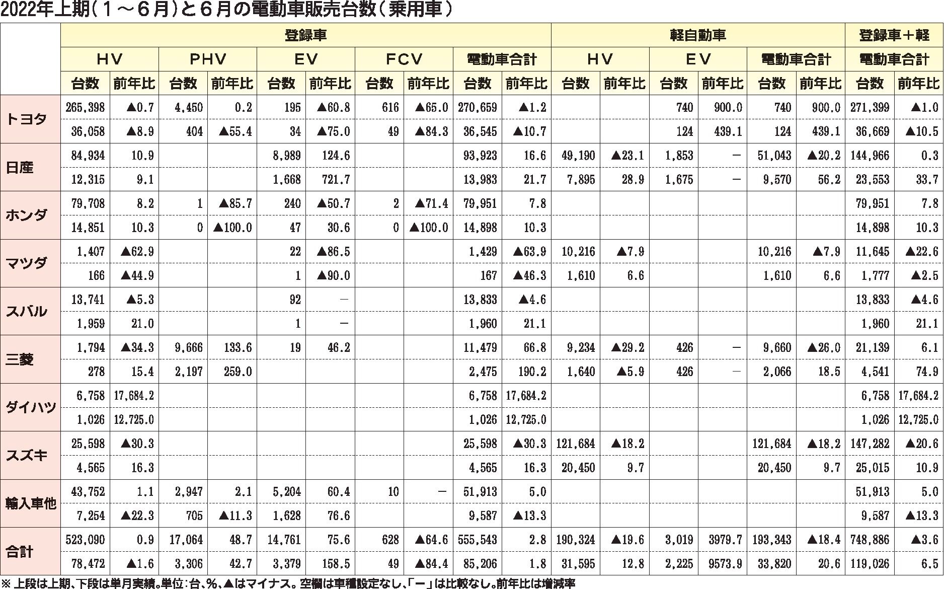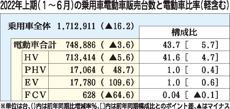 2022年上期(1~6月)の電動車販売台数(乗用車、登録車・軽自動車合計)は、前年同期比3・6%減の74万8886台と、上期として2年ぶりに前年を下回ったものの、構成比は5・7㌽増の43・7%となった。中でも電気自動車(EV)は1万778...