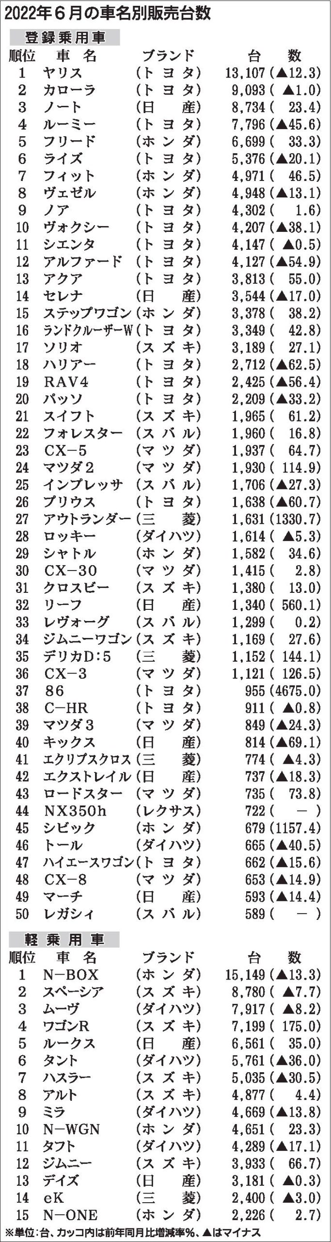 〈2022年6月の車名別販売台数〉