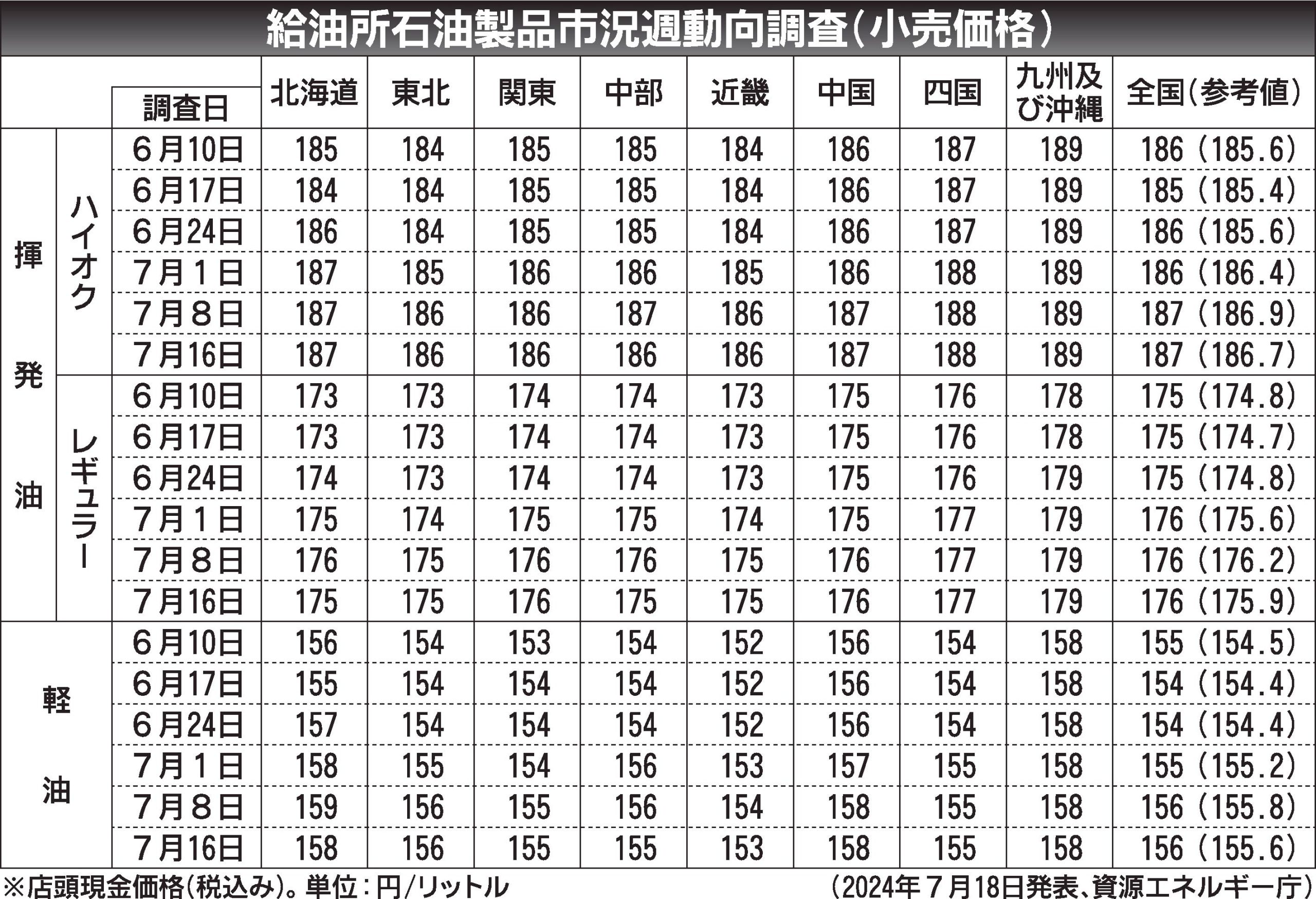 〈給油所石油製品市況週動向調査(小売価格)〉2024/6/10~7/16