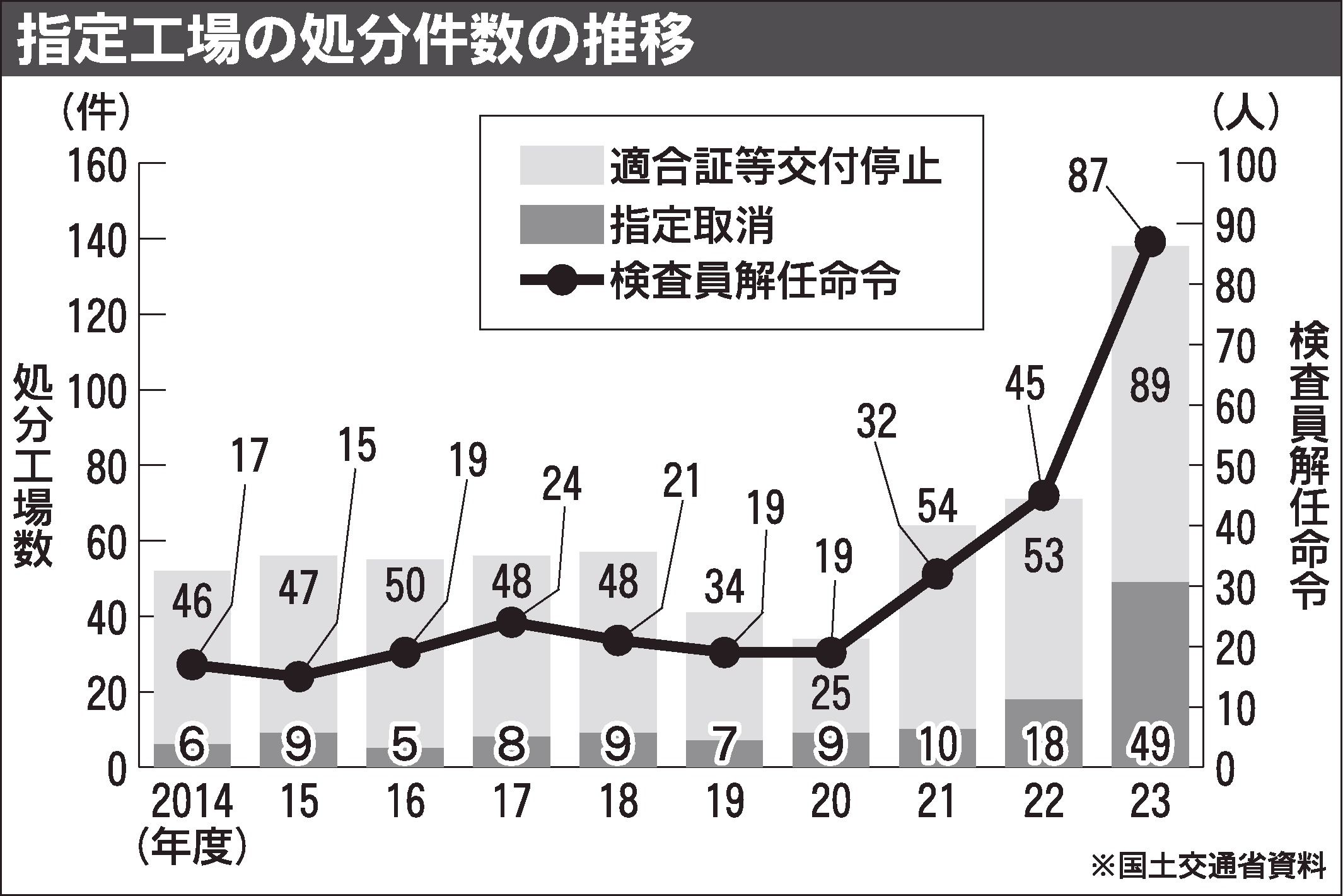 国土交通省は、2023年度の指定整備事業者に対する行政処分件数などをまとめた。道路運送車両法に基づく最も重い行政処分である「指定取消」の件数は、前年度比31件増の49件と大幅に増えた。「自動車検査員の解任命令」も前年度の倍近い87人にのぼ...