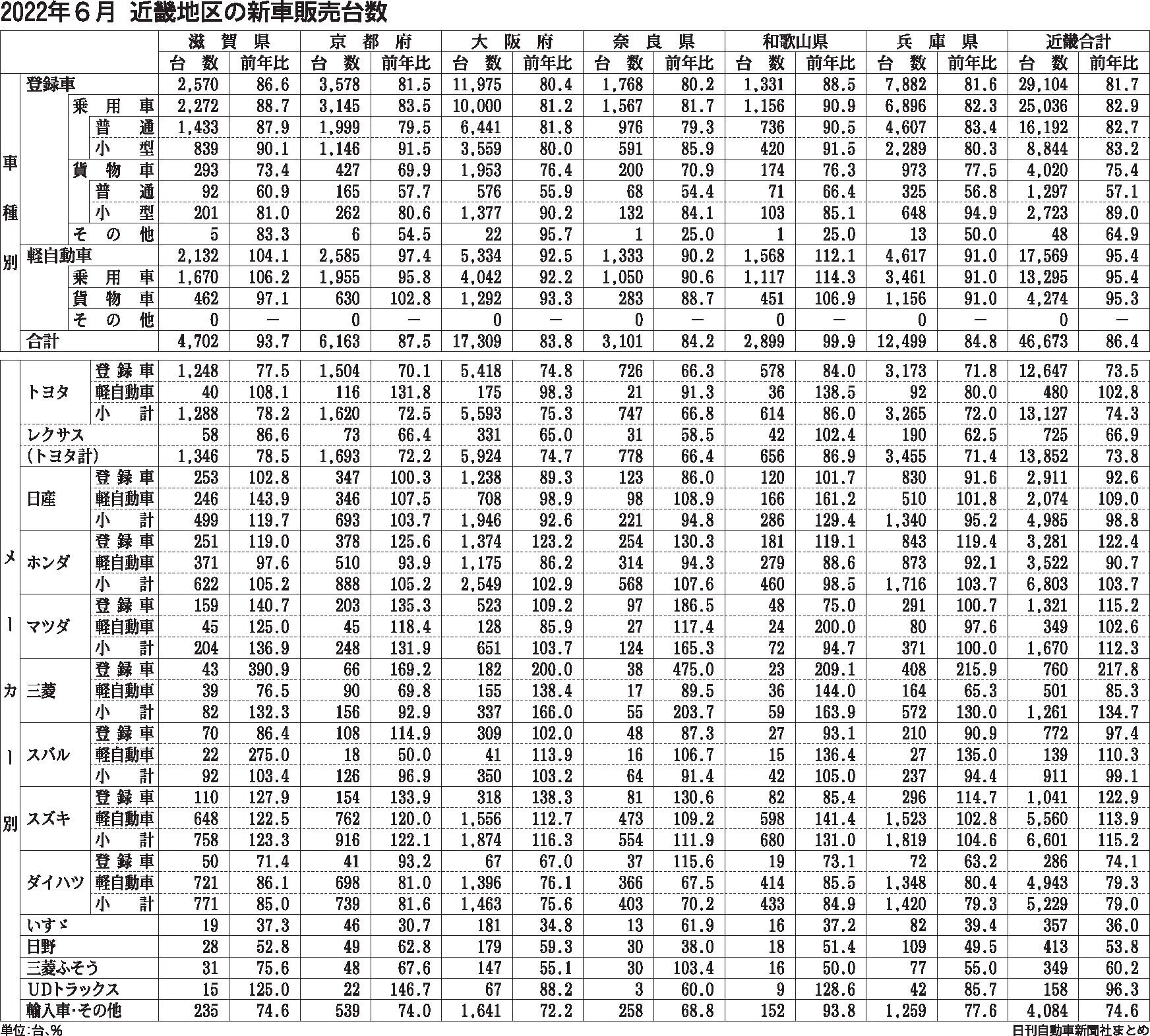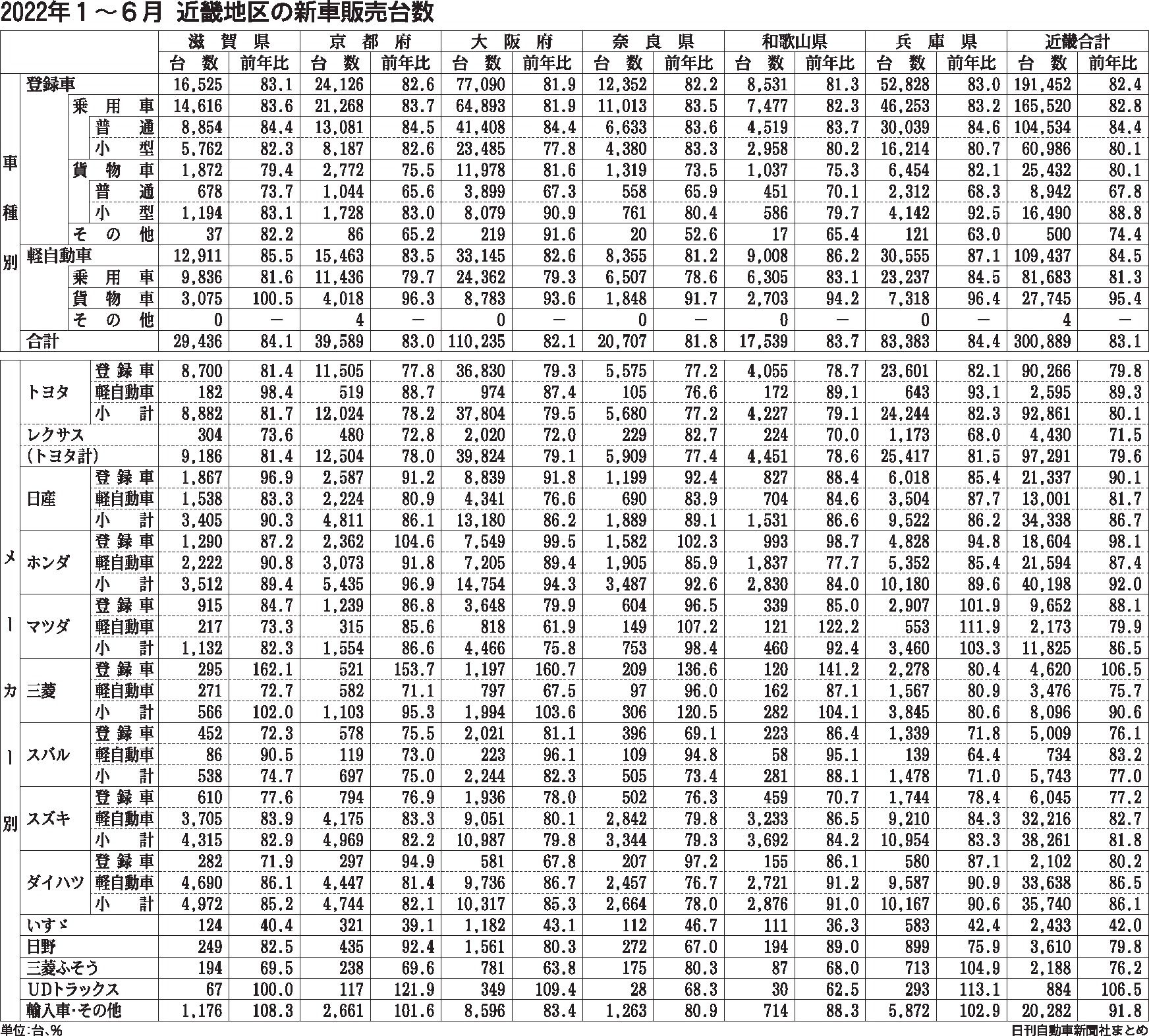 近畿2府4県の2022年上期(1~6月)の新車販売台数(登録車+軽自動車)は、2年ぶりの前年割れとなる前年同期比16・9%減の30万889台だった。新車供給の制約によって販売台数が伸び悩んだ。10年以降の近畿上期市場で販売台数が最も低かっ...