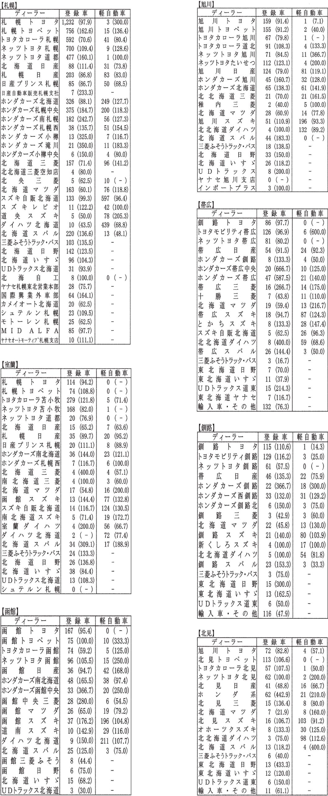 〈6月度全道管内別ディーラー別新車登録・届け出台数(カッコ内は前年同月比)〉札幌管内ホンダ系・スズキ系の登録台数は自販連正会員分