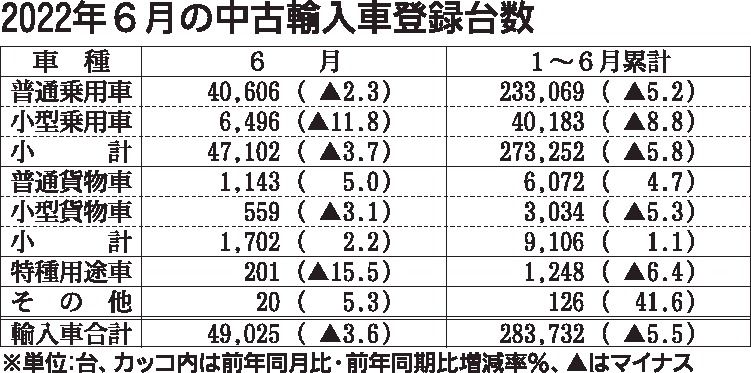 6月は前年同月比3.6%減の4万9025台だった。前月に比べて減少幅が3ポイント広がるなど、中古輸入車も品不足感が強まっている。一方、貨物車は2カ月連続でプラスとなった。