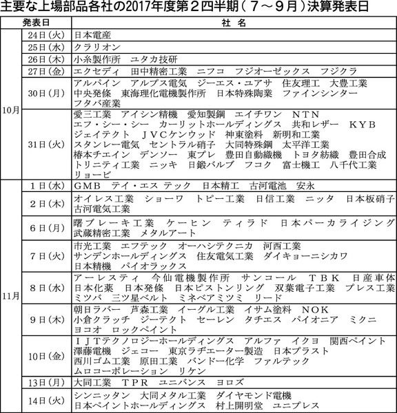 【主な上場部品各社の2017年度第2四半期(7~9月)決算発表日】