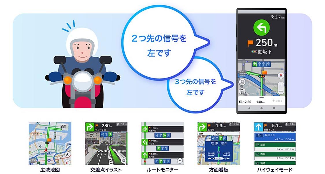目的地やルート上の走行地点から15キロメートル先の天気情報も案内し、利用者が急な天候の変化に備えられるようにした。また、ツーリングの楽しみ方を広げる機能として、近くの飲食店や観光スポットを知らせる「スポット情報通知」なども搭載。