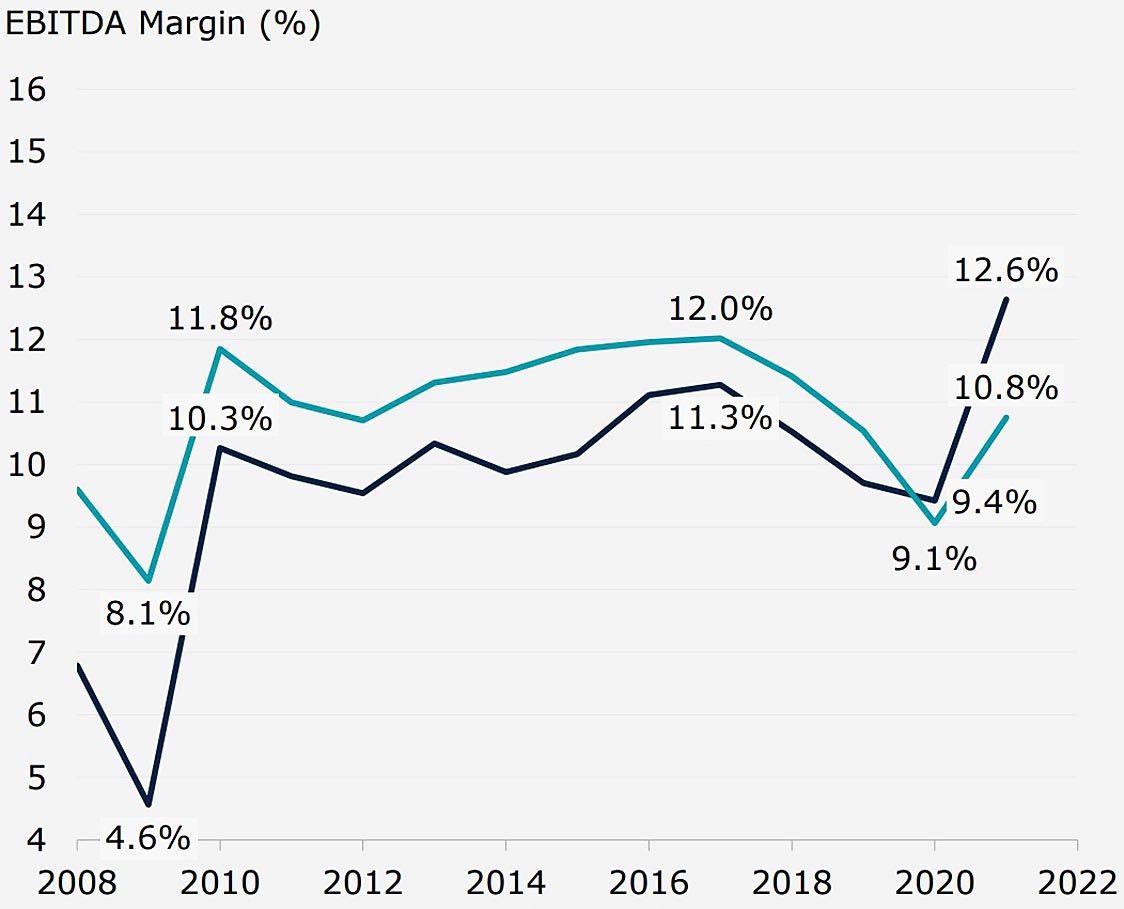 EBITDA(税引き前・利払い前・償却前利益)はデータが残る08年以降、部品メーカーが自動車メーカーを上回り続けていたが、コロナ禍で自動車市場が急激に落ち込んだ20年に逆転し、21年にはその差が開いたという。