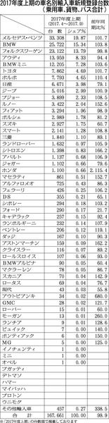 17年度上期の車名別輸入車新規登録台数は、全体が前年同期比0・1%減の16万7661台だった。上位では首位のメルセデス・ベンツ、2位のBMWが前年実績を上回ったほか5位のBMWミニ、6位のトヨタがプラスとなった。また7位のボルボは2桁増を...