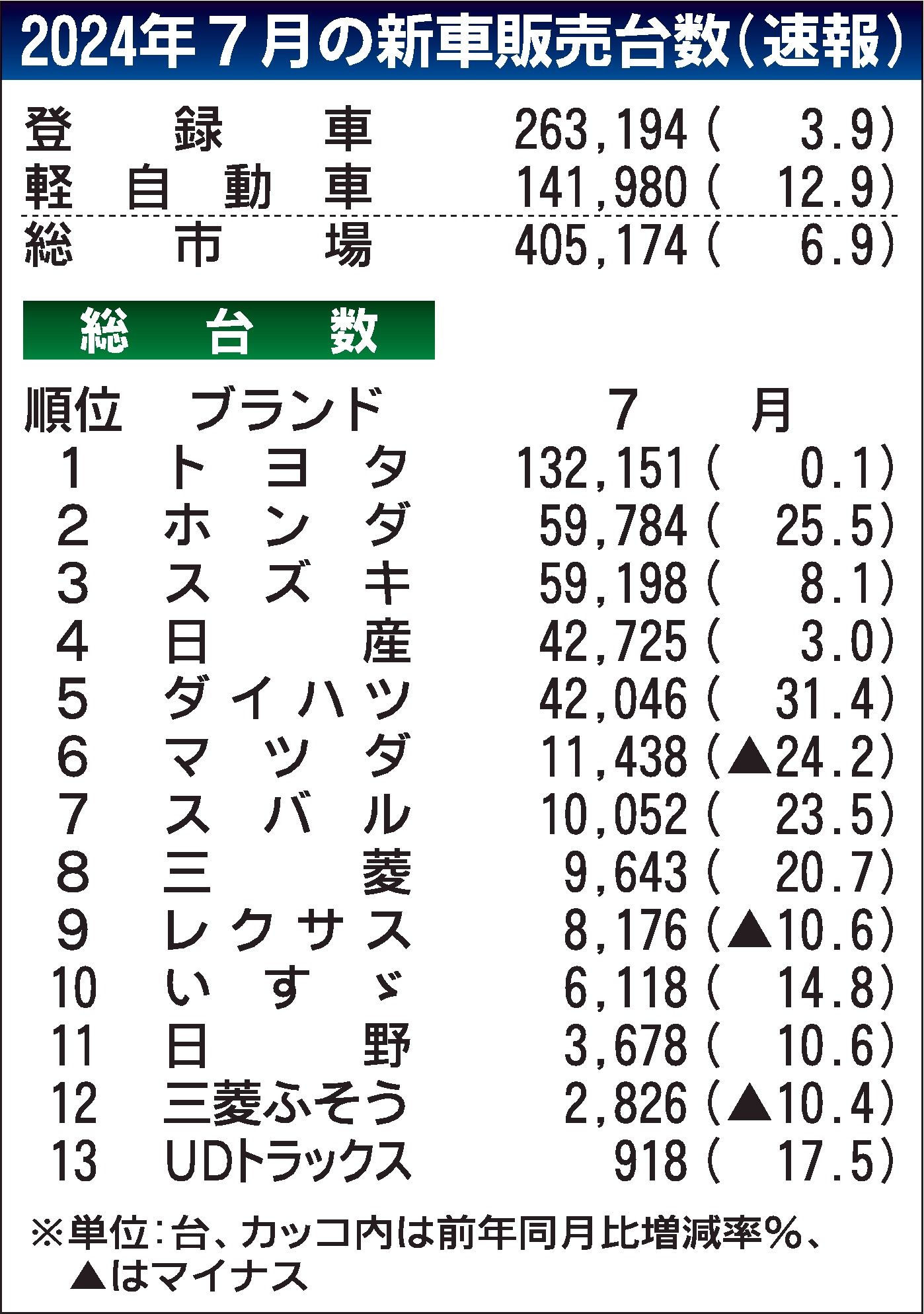 2024年7月の新車販売(登録車と軽自動車の合計)は、7カ月ぶりのプラスとなる40万5174台(前年同月比6.9%増)だった。ダイハツ工業の認証不正に伴う影響がほぼなくなり、軽販売が8カ月ぶりに前年を超えた。登録車も7カ月ぶりにプラスに転...