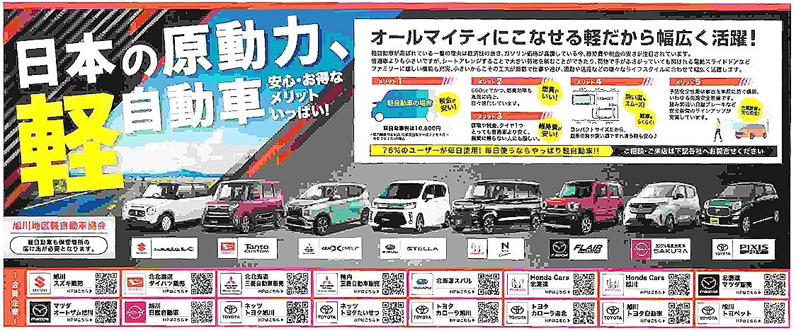 【旭川】旭川地区軽自動車協会(松倉直幸会長)は、コロナ禍で中止した軽自動車フェアに代わる軽の普及促進策に取り組む。11月12、13日に「軽自動車の日」として会員各社の拠点で統一イベントを開く。また地元紙への広告展開で軽のメリットを広く地域...