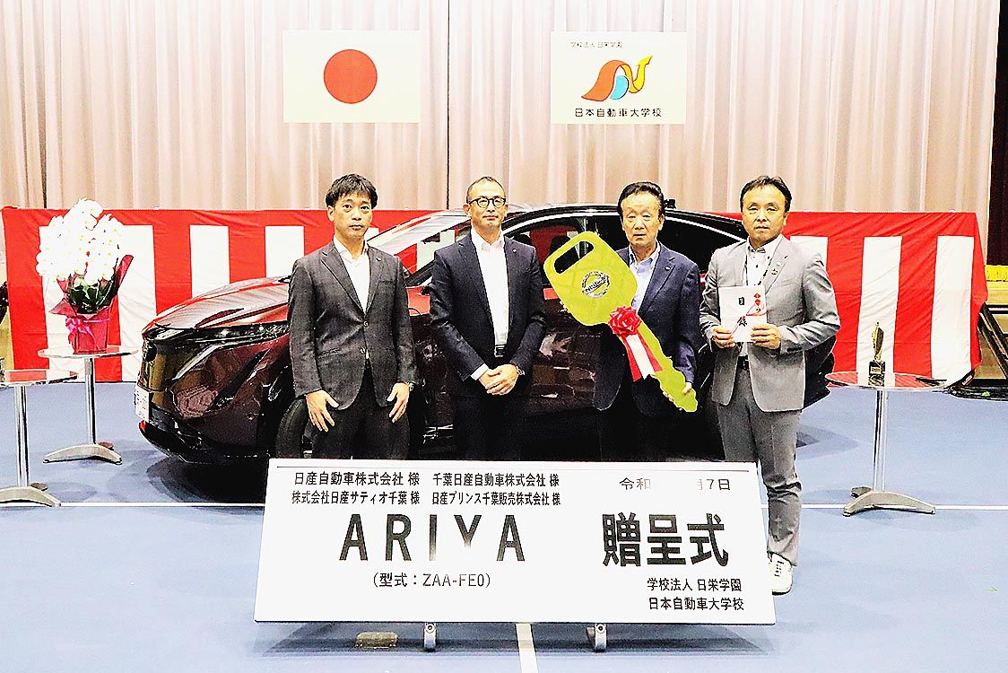 【千葉】日産自動車と千葉日産(横田好之社長)、日産プリンス千葉(同)、日産サティオ千葉(太田学社長)は、日本自動車大学校(矢部明理事長・学校長)に、教材車として電気自動車(EV)「アリア」を寄贈した=写真。 同校イベントホールで開かれた贈...