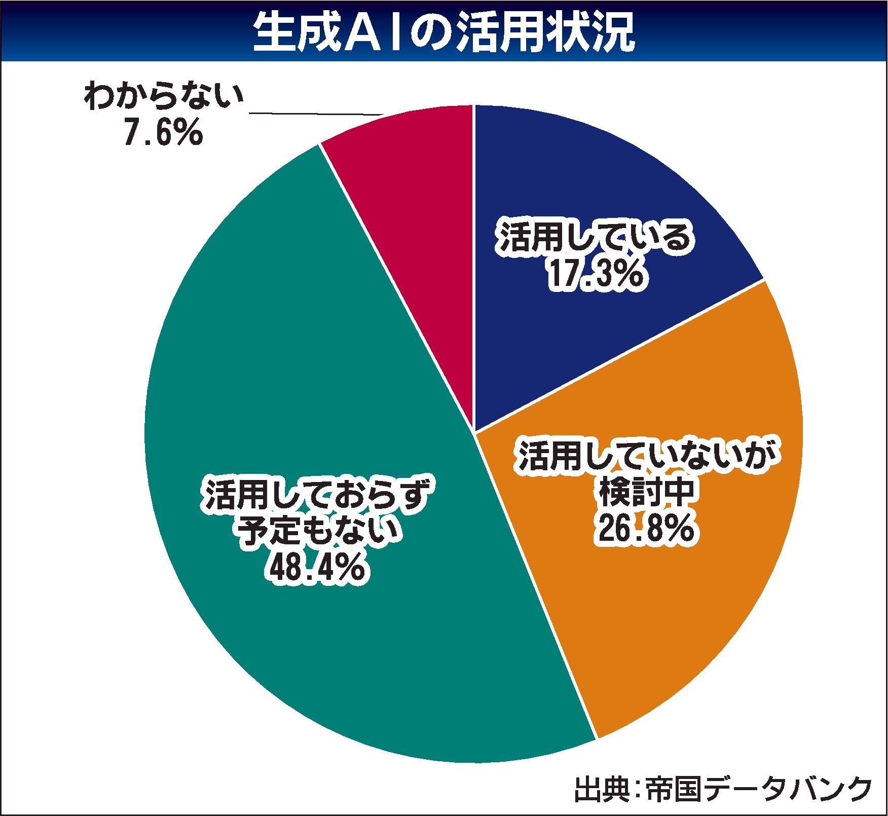 帝国データバンクは、企業の生成AI(人工知能)活用状況をまとめた。生成AIを活用している企業は調査対象の2割未満にとどまり「活用しておらず、予定もない」と回答した企業が約半数を占めた。同社は「活用を進めていくためには、生成AIがもたらすリ...