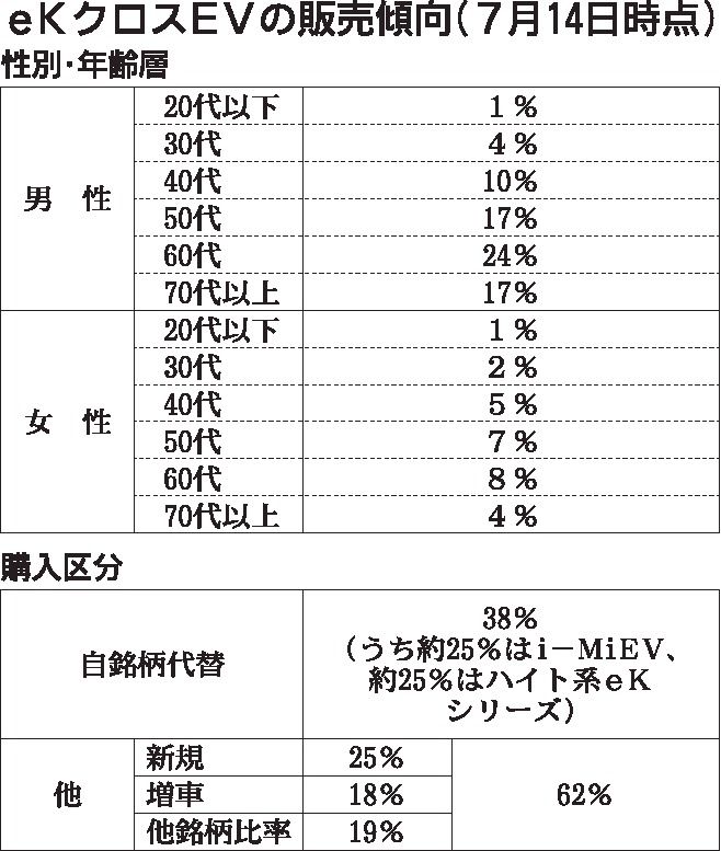 三菱自動車が軽乗用の電気自動車(EV)「eKクロスEV」の受注を開始してから2カ月が経過した。5月20日から7月14日までの受注台数は月販目標の6倍に当たる4923台に上る。実際にどのようなユーザーから受注しているのか、販売動向を同車種の...