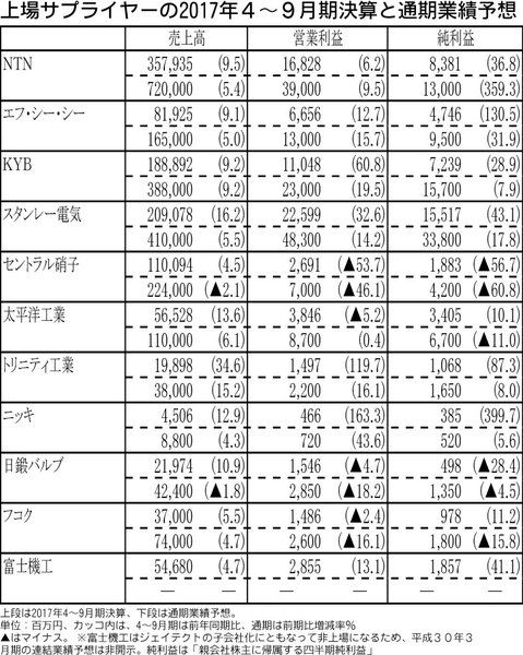 【上場サプライヤーの2017年4~9月期決算と通期業績予測】
