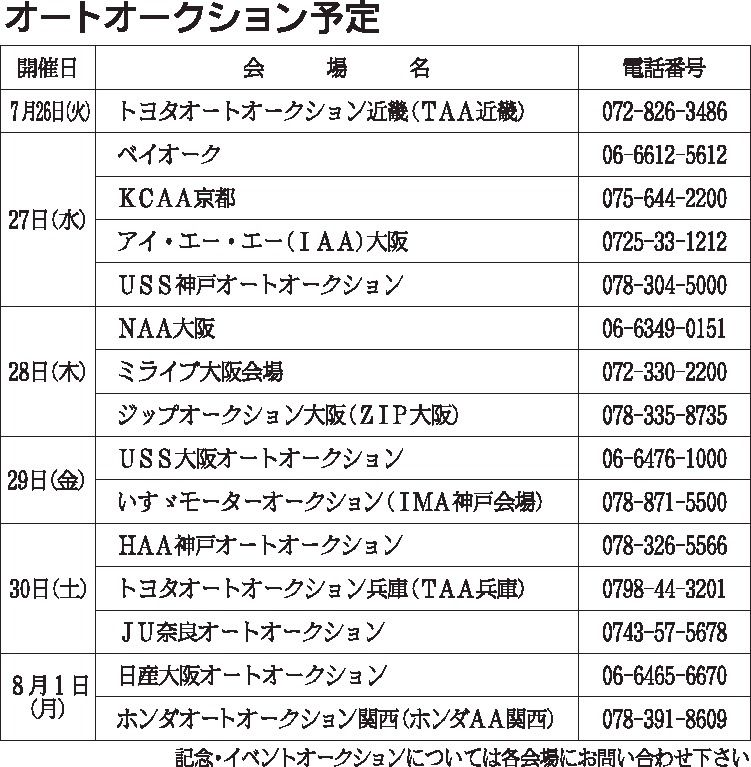 〈オートオークション予定〉近畿地区 2022/7/26~8/1