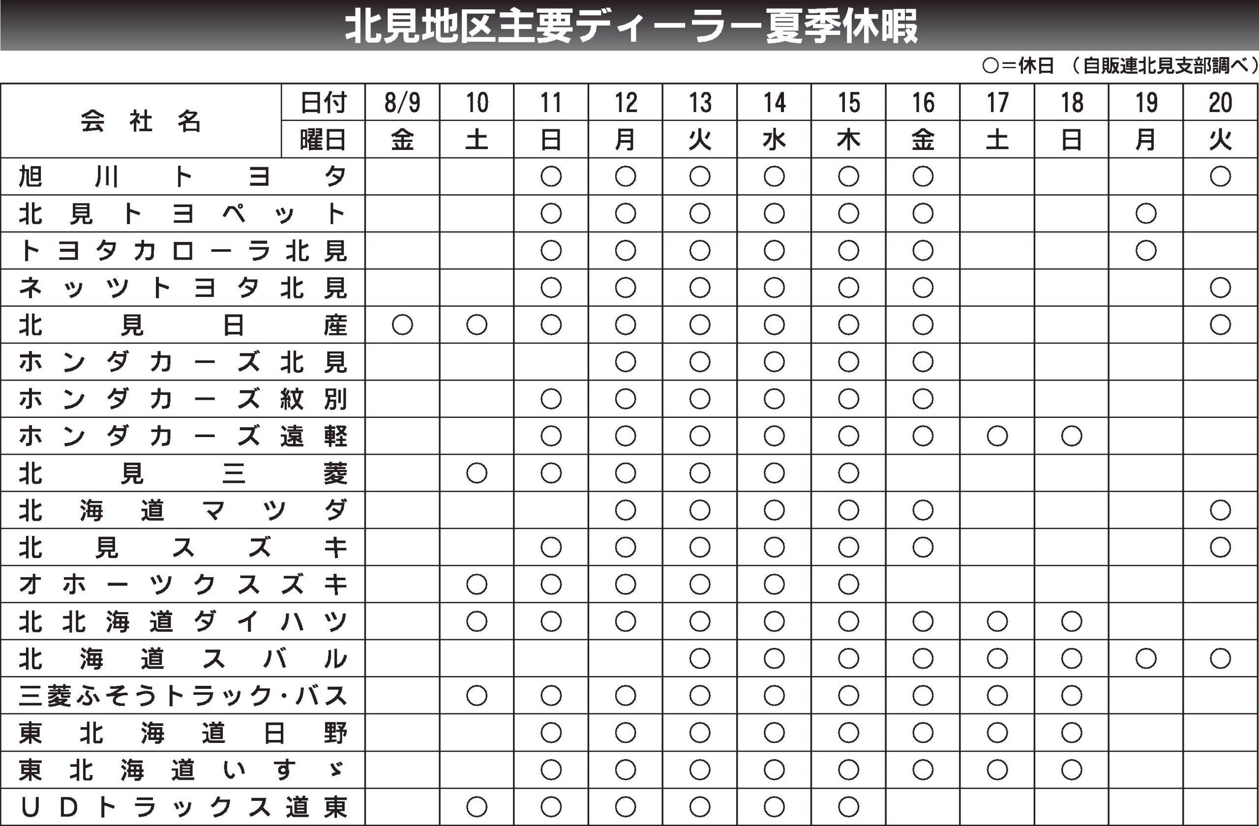 〈北見地区主要ディーラー夏季休暇〉2024/8/9~20