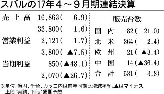 スバルは6日、2018年3月期業績を下方修正した。米国や中国での販売環境悪化を織り込み、世界販売を前回予想比3万7600台減の106万7900台とした。加えて完成車検査問題の対策費用として100億円を織り込んだ。その結果、売上高を同400...