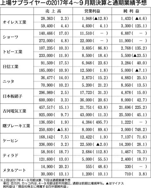 【上場サプライヤーの2017年4~9月期決算と通期業績予想】