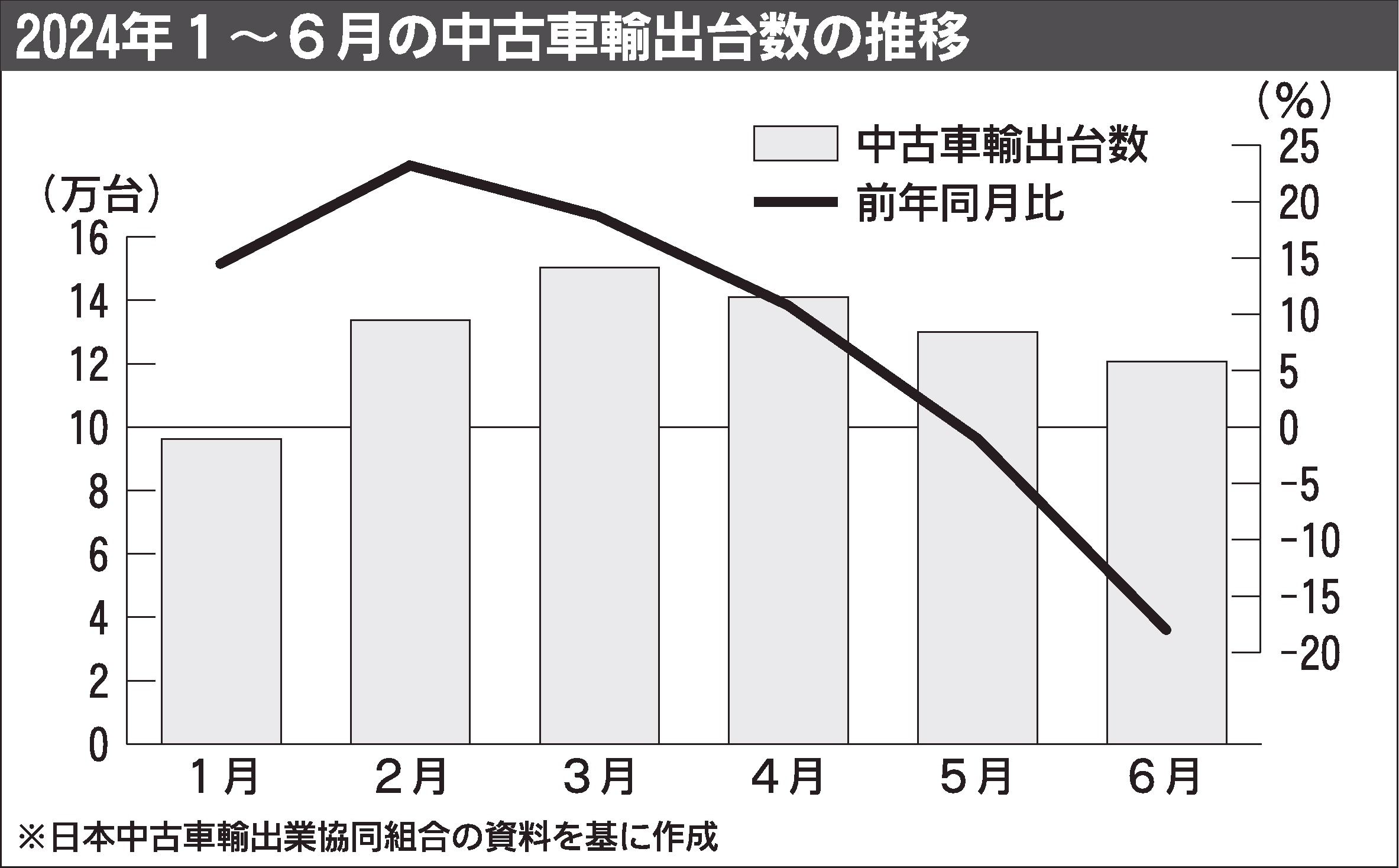 日本中古車輸出業協同組合(JUMVEA、佐藤博理事長)がまとめた6月の中古車輸出台数(車両価格20万円以上)は、前年同月比18.0%減の12万713台となり、2カ月連続で前年実績を割り込んだ。前月に比べて下げ幅が17.0㌽も拡大するなど、...