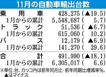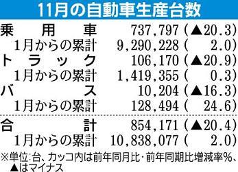 日本自動車工業会(自工会、青木哲会長)は25日、11月の四輪車生産・輸出実績を発表した。四輪車生産は前年同月比20・4%減と、統計を開始した1967年以降、単月としては過去最大のマイナス幅を記録。台数も85万4171台と11月として過去最...