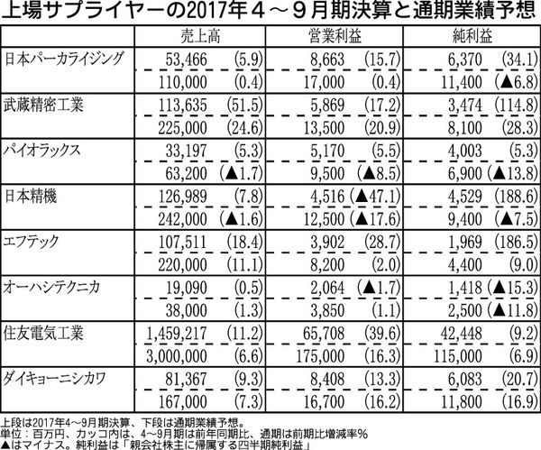 【上場サプライヤーの2017年4~9月期決算と通期業績予想】