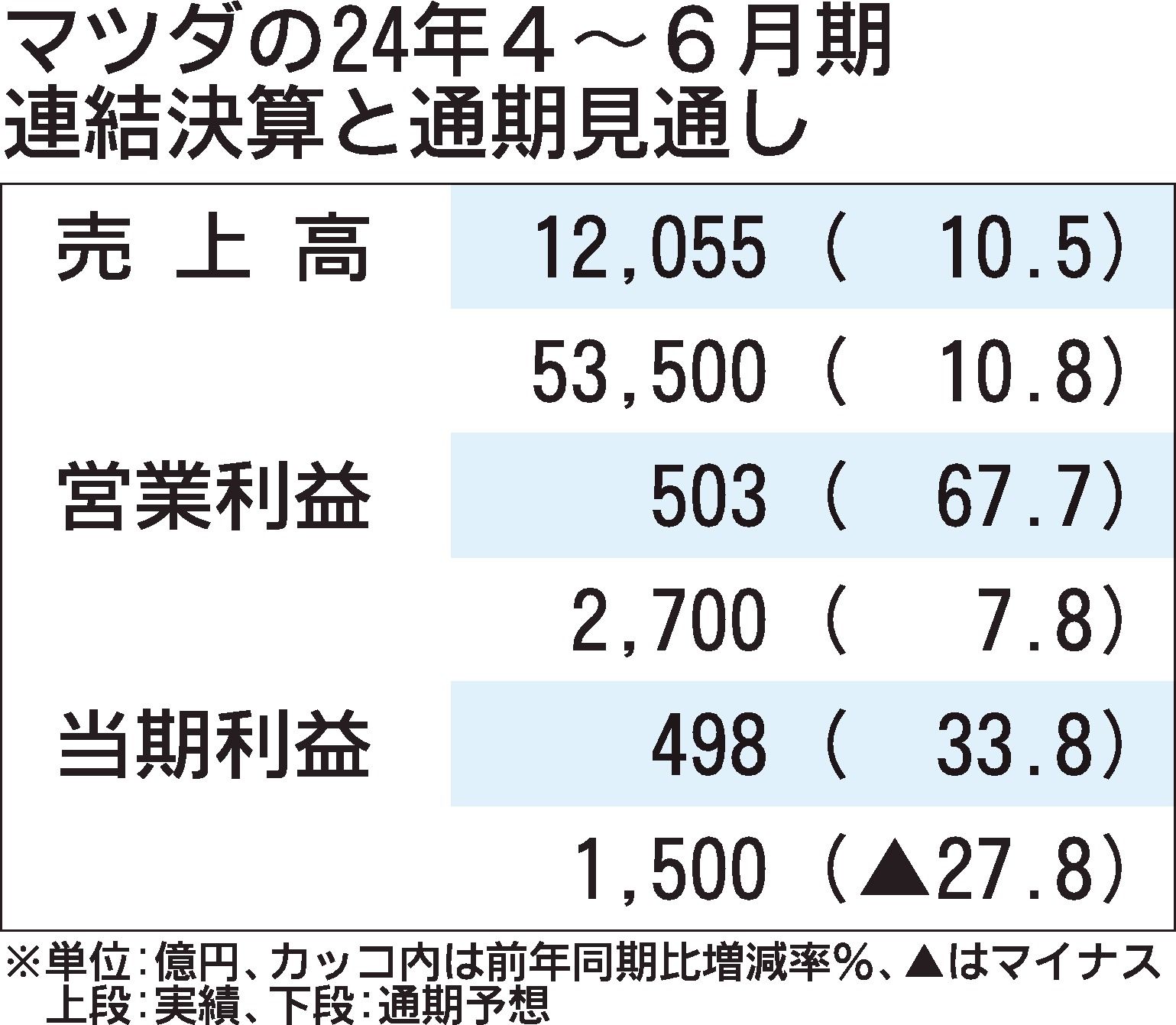 マツダが7日発表した2024年4~6月期決算の売上高は前年同期比10.5%増の1兆2055億円と、過去最高を更新した。販売好調の北米市場がけん引し、為替効果の439億円もあり、営業利益は同67.7%増と、同期として2年連続の増収増益となった。ただ、米国ではインセンティブ(販売奨励金)が増加傾向にあり、日本や中国の販売低迷も懸念材料だ。通期業績予想は、為替変動などから据え置いた。