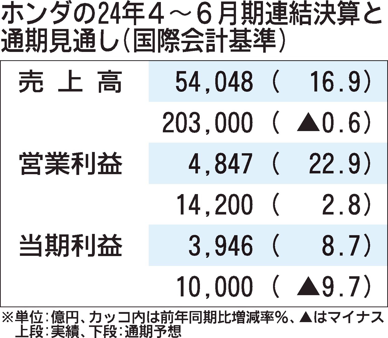 ホンダが7日発表した2024年4~6月期の営業利益(国際会計基準)は、前年同期比22.9%増の4847億円となり、すべての四半期を通じて過去最高を更新した。売上収益は4~6月期として過去最高だった。北米での販売費など経費は増加したものの、四輪車の値上げ効果や二輪車の販売拡大、円安効果などで増収増益となった。為替の先行きなどが不透明なため、通期業績予想は税引き前利益を除くすべての項目で据え置いたが、四輪車の販売計画は、中国の不振で390万台(前回予想は412万台)へと下方修正した。
