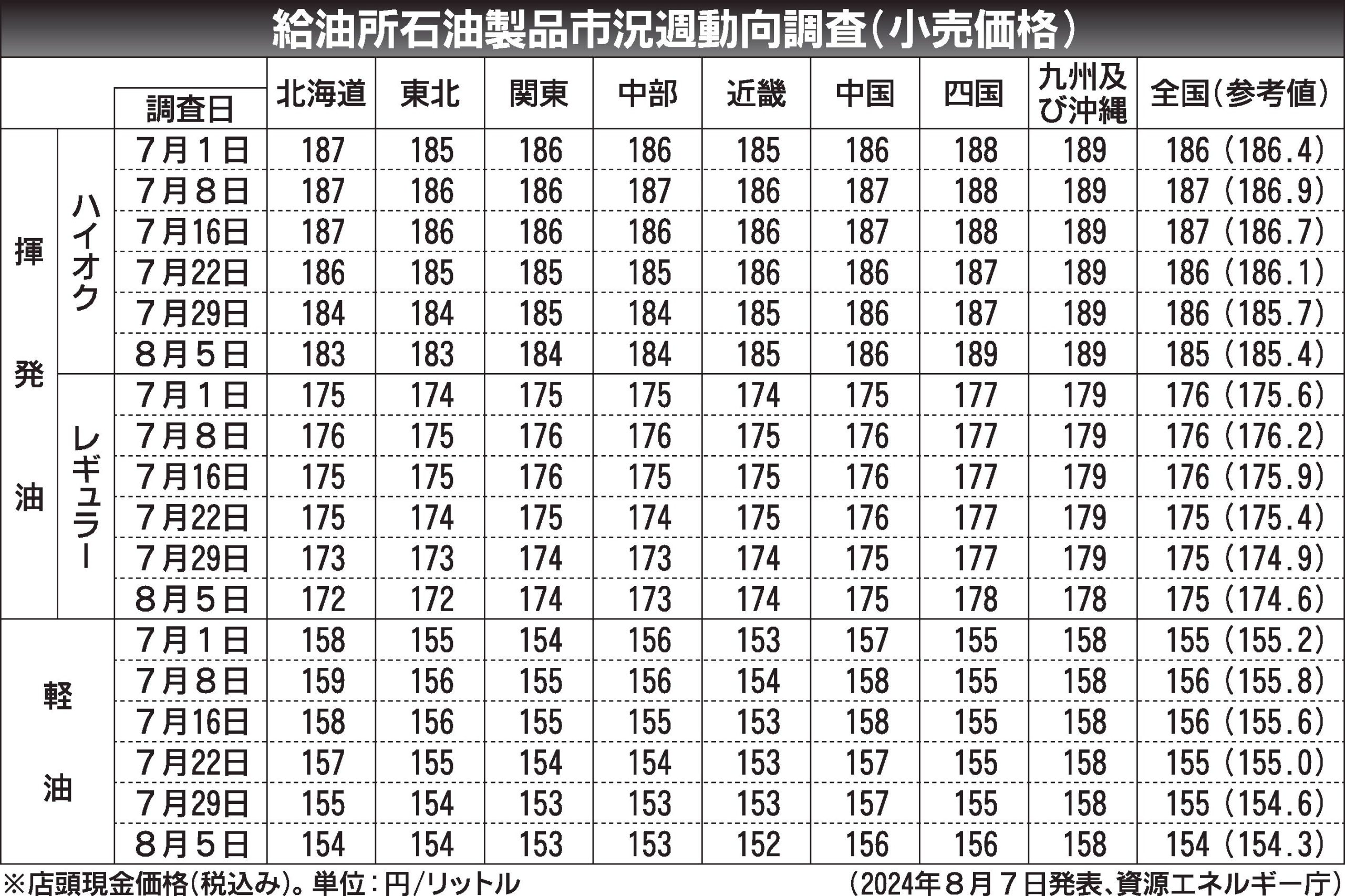〈給油所石油製品市況週動向調査(小売価格)〉2024/7/1~8/5