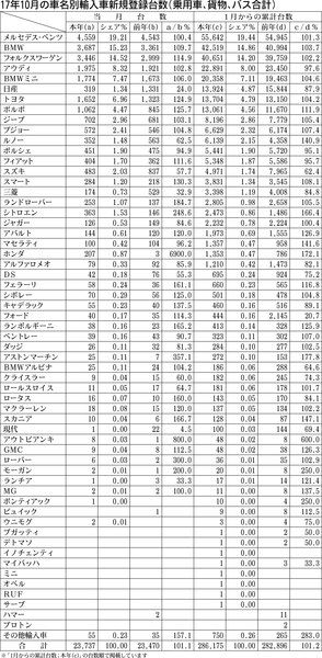 17年10月の車名別輸入車新規登録台数は、上位が軒並みプラスとなった。中でもフォルクスワーゲンは前年同月比14・9%増と大幅な伸びを示した。BMWも2桁近いプラスとなった。首位のメルセデス・ベンツは横ばい。 この他では,ボルボが同25・7...