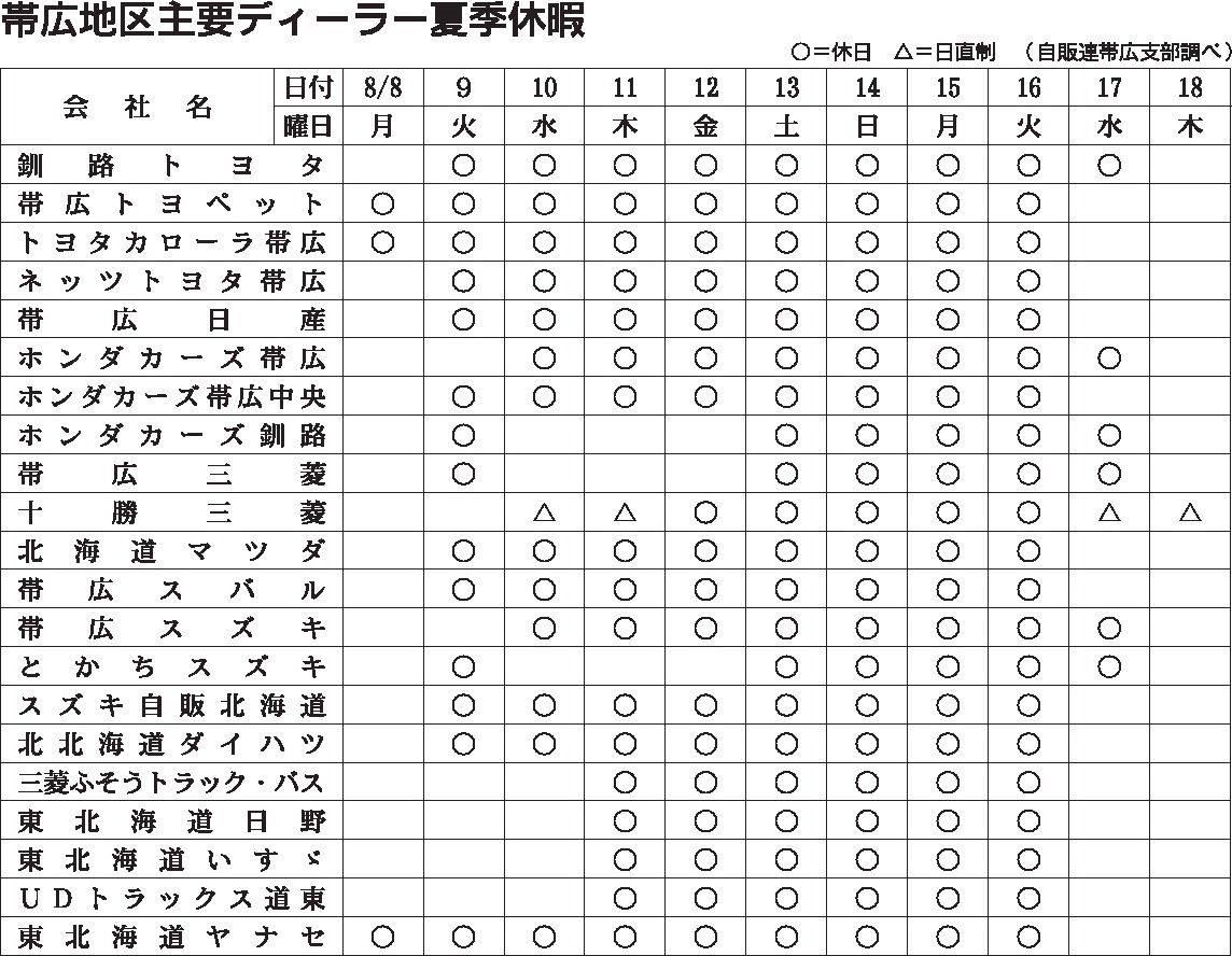 〈帯広地区主要ディーラー夏季休暇〉2022/8/8~18
