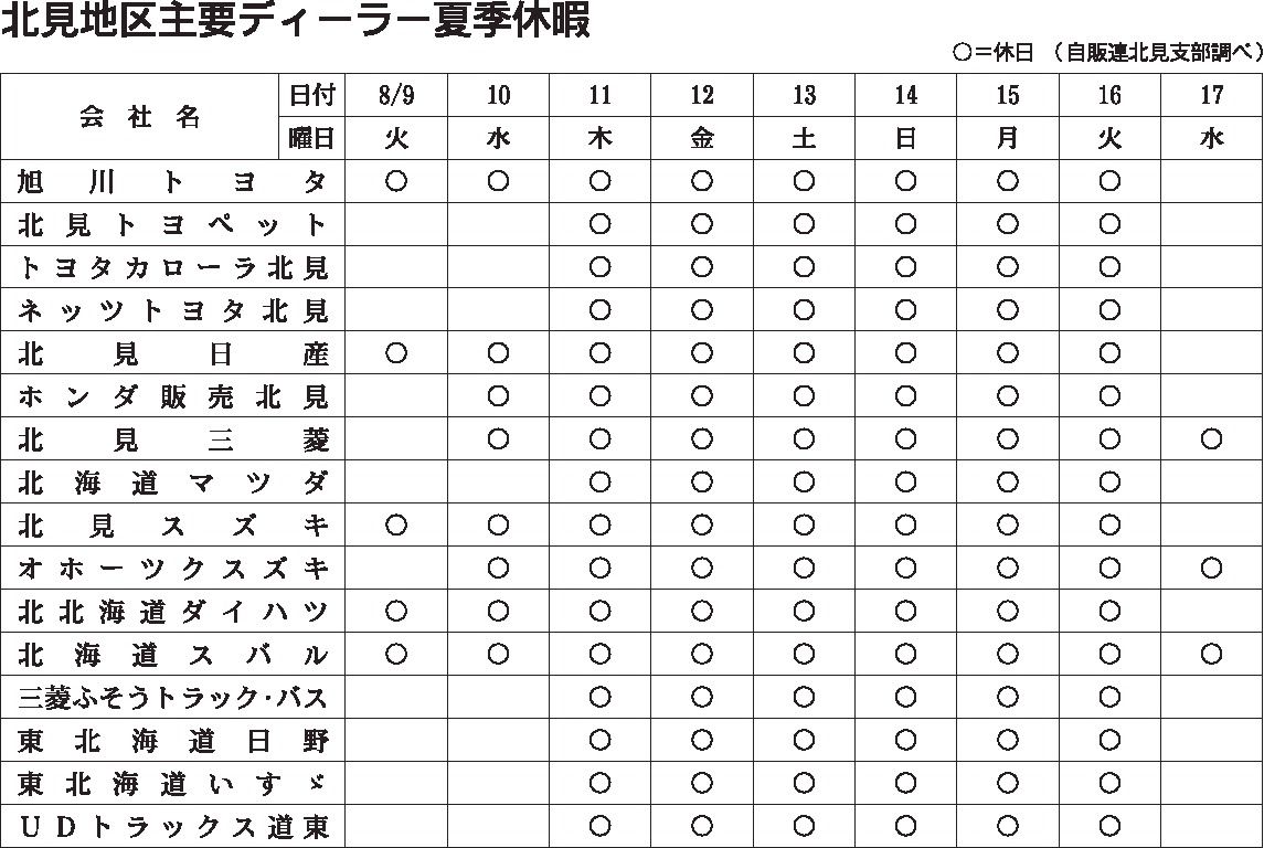 〈北見地区主要ディーラー夏季休暇〉2022/8/9~17