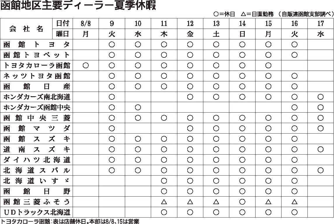〈函館地区主要ディーラー夏季休暇〉2022/8/8~17