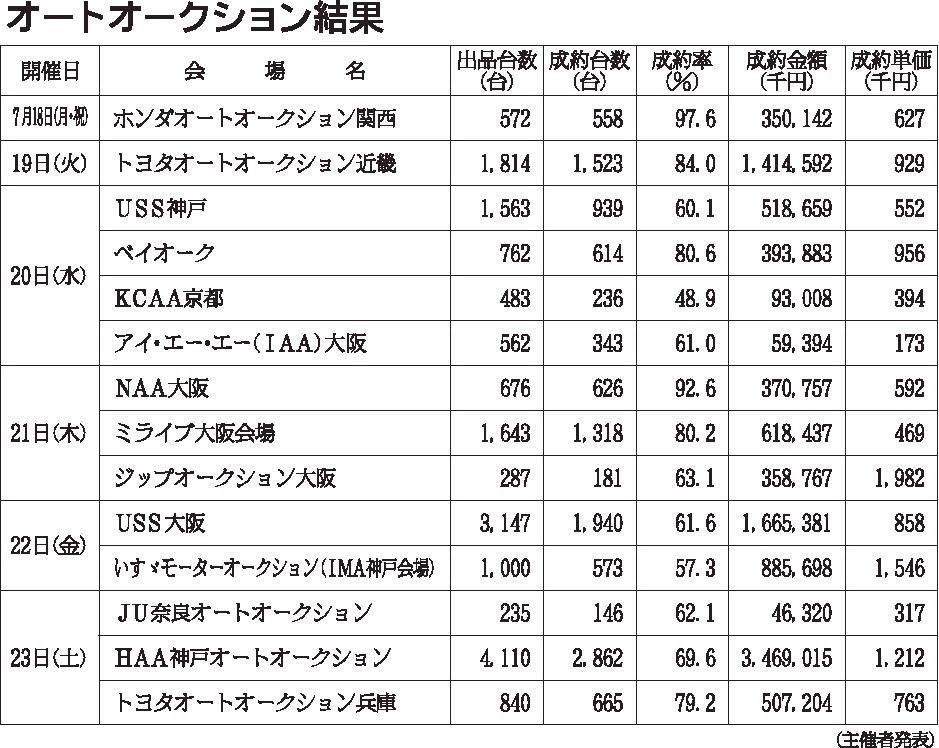 〈オートオークション結果〉近畿地区 2022/7/18~23