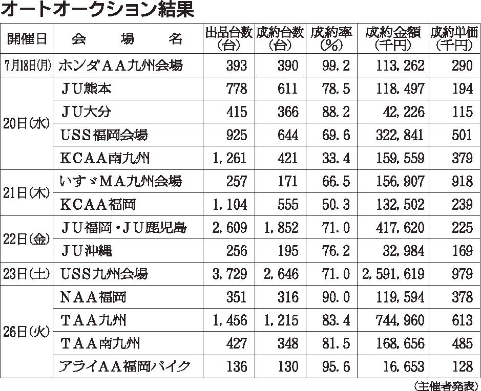 〈オートオークション結果〉九州地区 2022/7/18~26