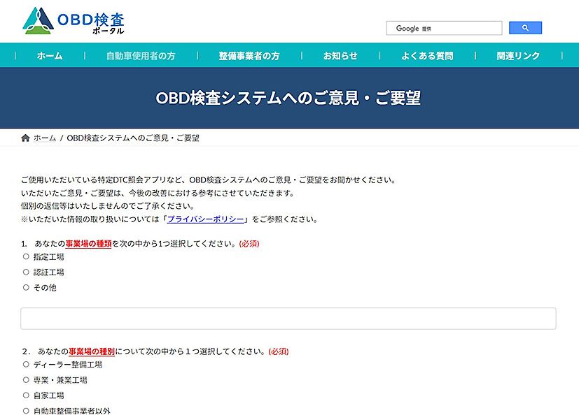 自動車技術総合機構、「OBD検査ポータル」に意見や要望を記載できるページを開設