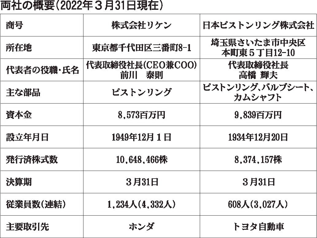 両社はピストンリングをはじめ内燃機関部品が主力で、リケンの主な取引先がホンダで、日本ピストンリングがトヨタ自動車。ライバル会社同士だが、経営統合によって生産拠点の最適化、コスト競争力の強化、非自動車向けエンジン事業の新規創出などを進める。