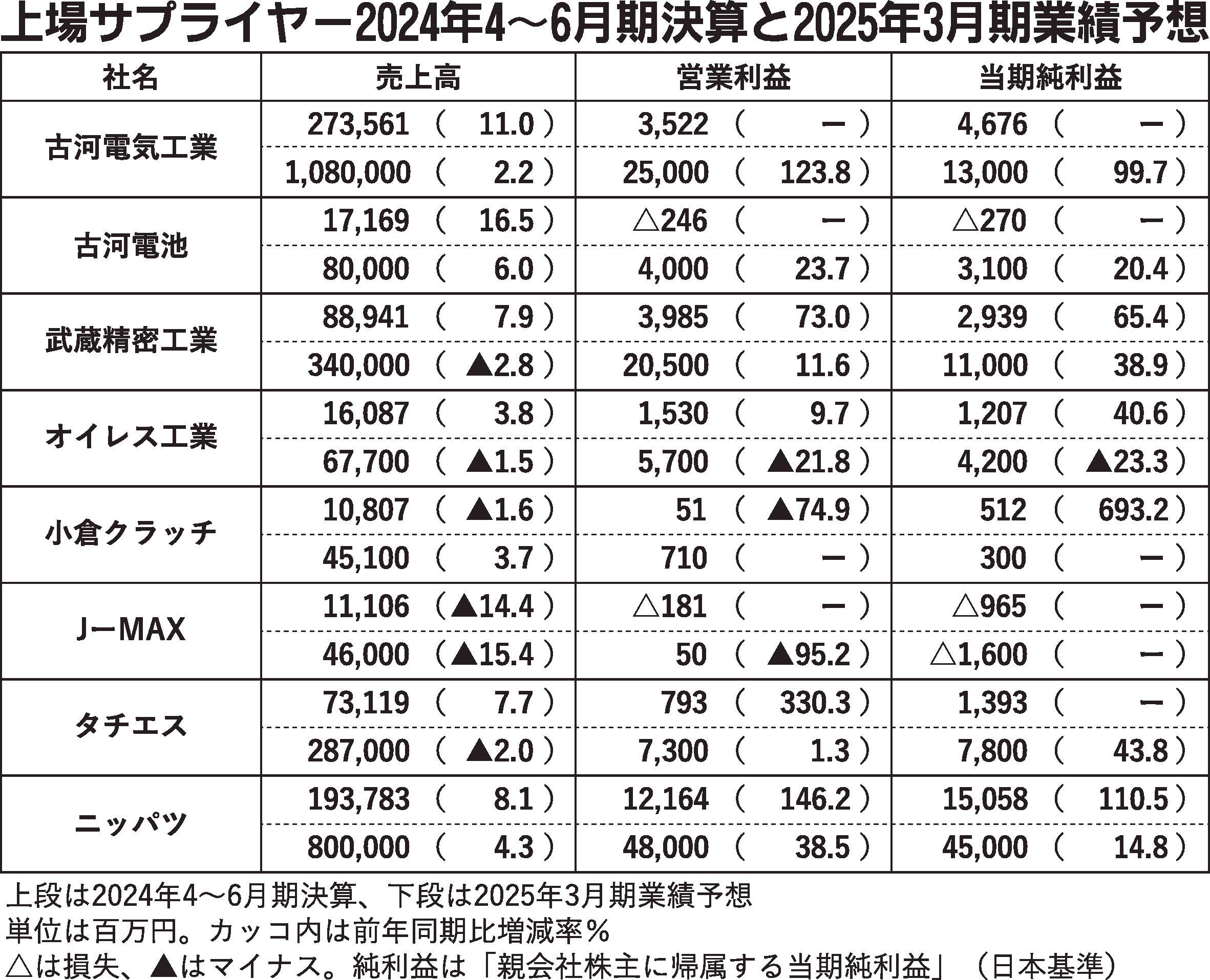 〈上場サプライヤー2024年4~6月期決算と2025年3月期業績予想〉(8/14付)