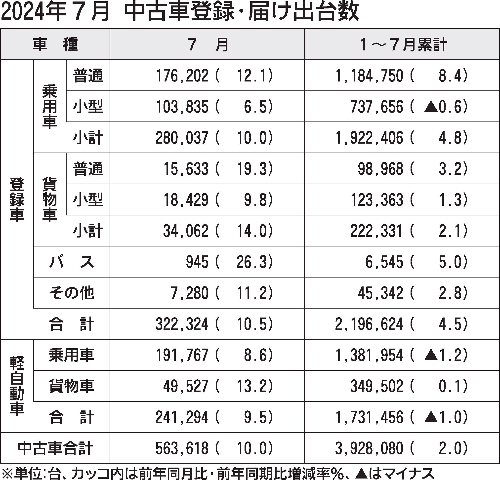 自販連が公表した7月の中古車登録台数は、同10.5%増の32万2324台で2カ月ぶりのプラスとなった。乗用車は同10.0%増の28万37台で、貨物車も同14.0%増の3万4062台だった。