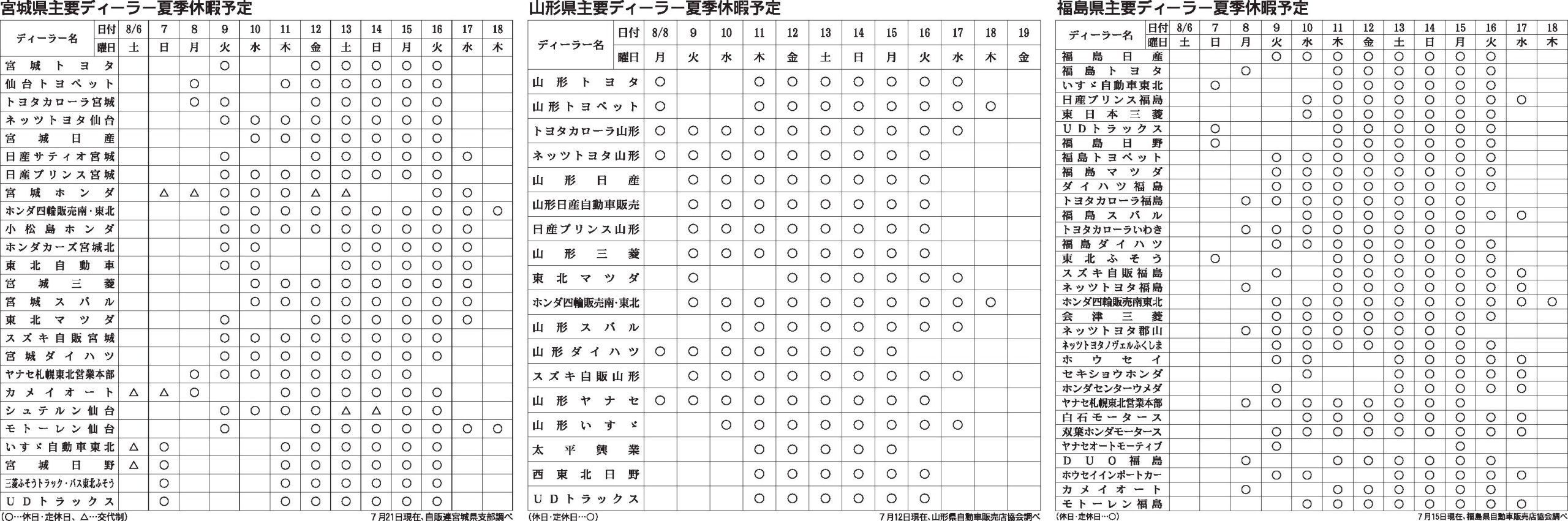 〈宮城県/山形県/福島県主要ディーラー夏季休暇予定〉2022/8/6~19