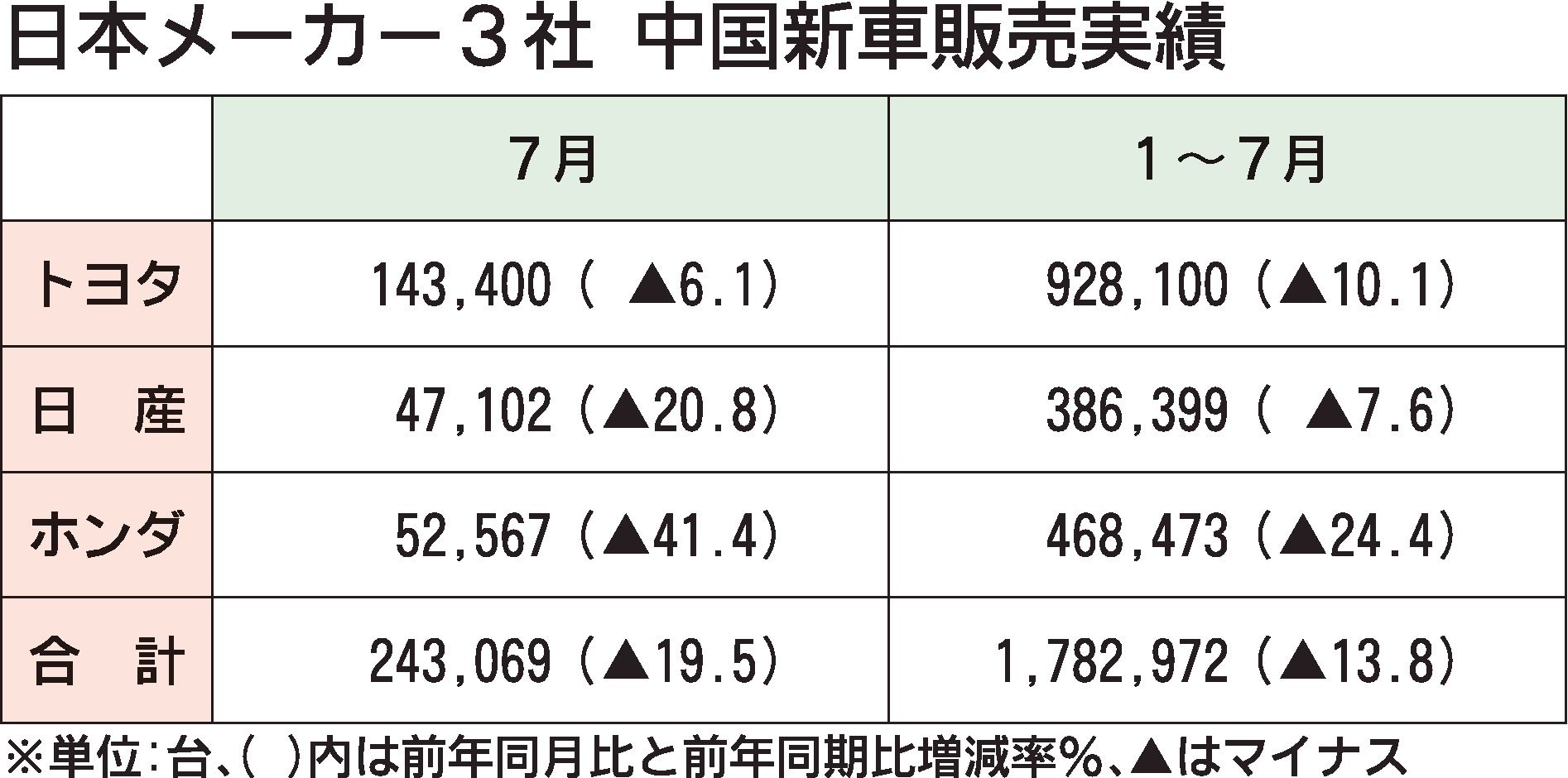 7月の日本の自動車メーカー3社の中国新車販売は前年同期比19.5%減の24万3069台にとどまった。1~7月の累計でも13.8%減だ。新エネルギー車(NEV)の激しい価格競争が続く中、日本メーカーの苦境が続く。 トヨタ自動車の7月の中国販...