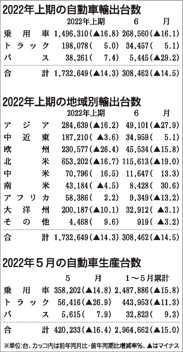 日本自動車工業会(自工会、豊田章男会長)が29日にまとめた2022年上期(1~6月)の四輪車の輸出台数は前年同期比14.3%減の173万2649台だった。半導体不足や新型コロナウイルス感染拡大に伴う部品調達難から日本の生産台数が減少したことが影響し、上期としては2年ぶりに前年を割り込んだ。